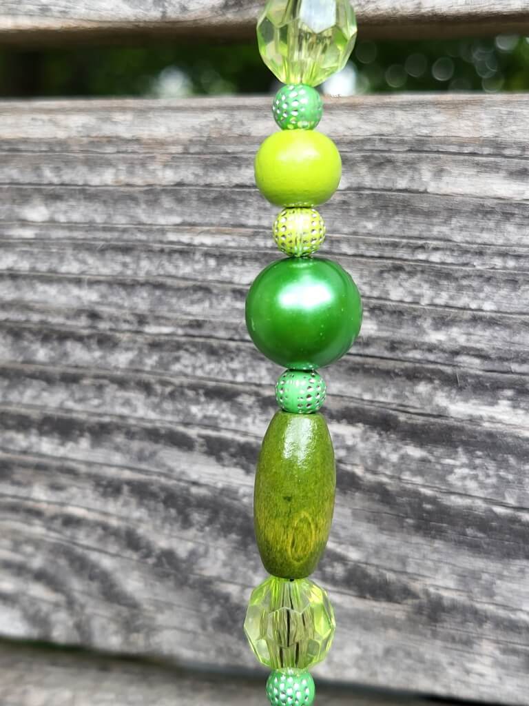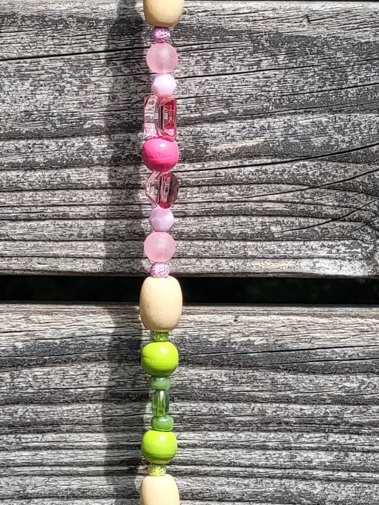 Die grünen und rosa Perlen wechseln sich mit Holzperlen und kleinen Rostblüten ab.