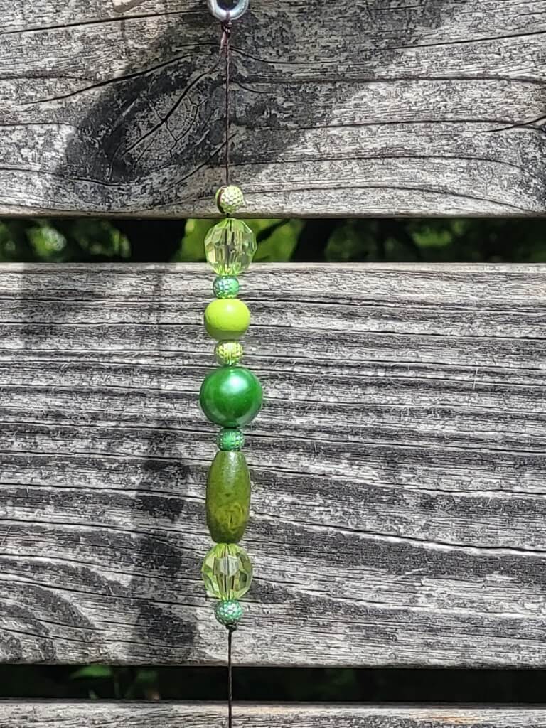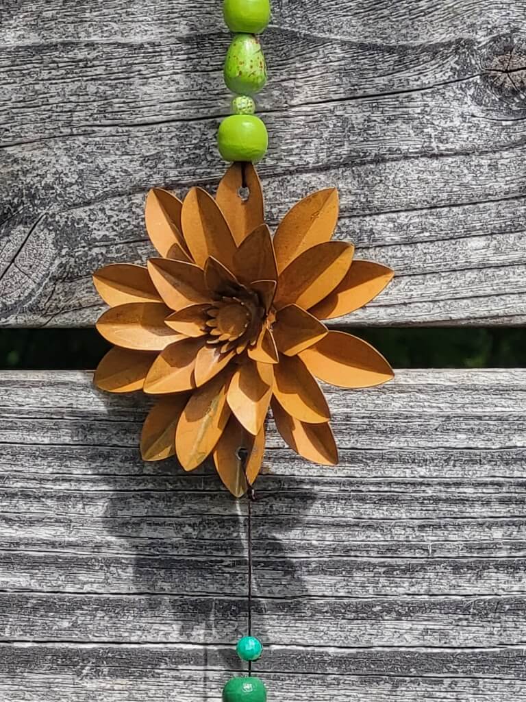 Ein romantisch inspiriertes Mobile mit Rostblüten und unzähligen Perlen in Grün und Rosa inkl. Bügel zum Aufhängen.