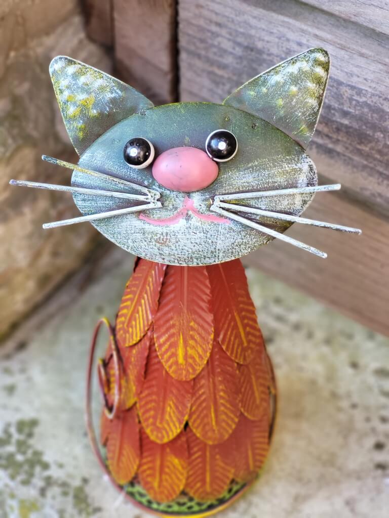 Diese aufwendig gearbeitete Katze schmückt jeden Zaun durch ihr lustiges Aussehen und ihre rosa farbene Nase.