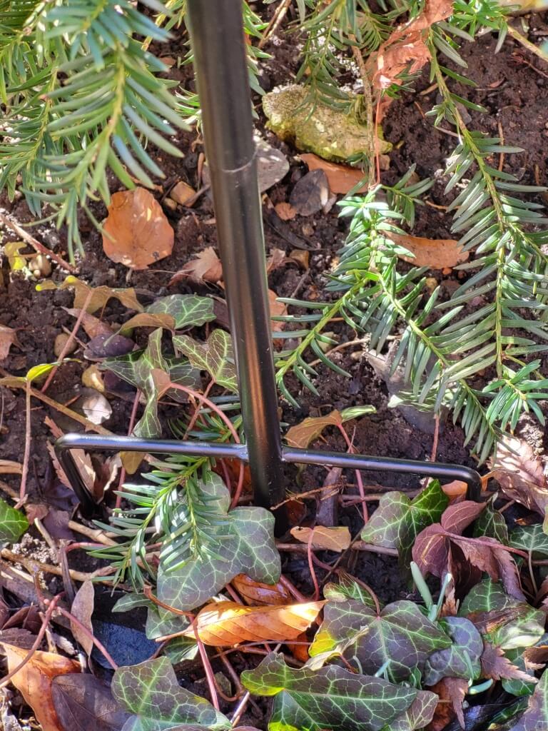 Der Stab ist dreiteilig und verfügt über einen Doppelspieß für einen sicheren Halt.