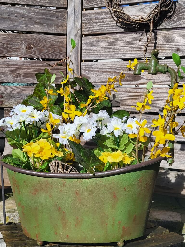 Ein außergewöhliches Pflanzgefäß ist unsere Pflanzwanne mit Wasserhahn in grün.