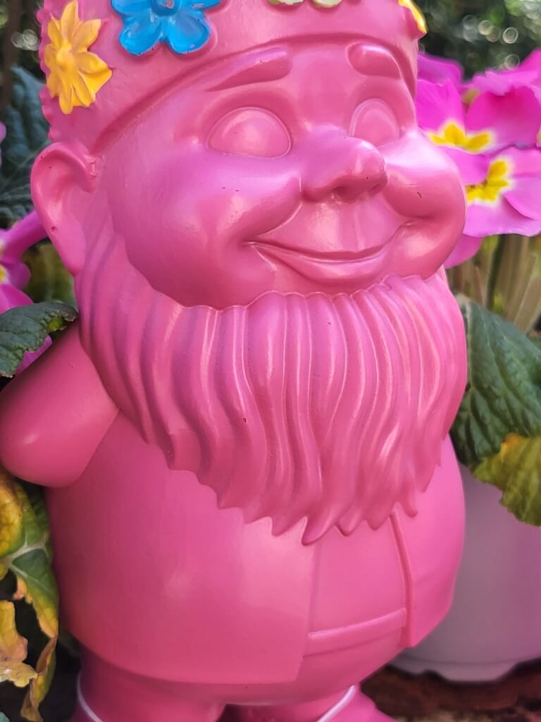 Der Gartenzwerg Flower Power ist in 3 knalligen Farben erhältlich (orange, pink, grün)