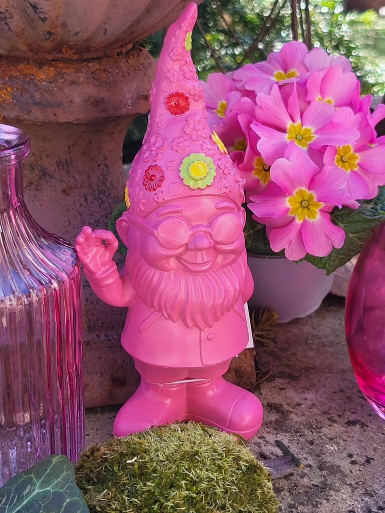 Der Gartenzwerg Happy ist in 3 knalligen Farben erhältlich (orange, pink, grün)