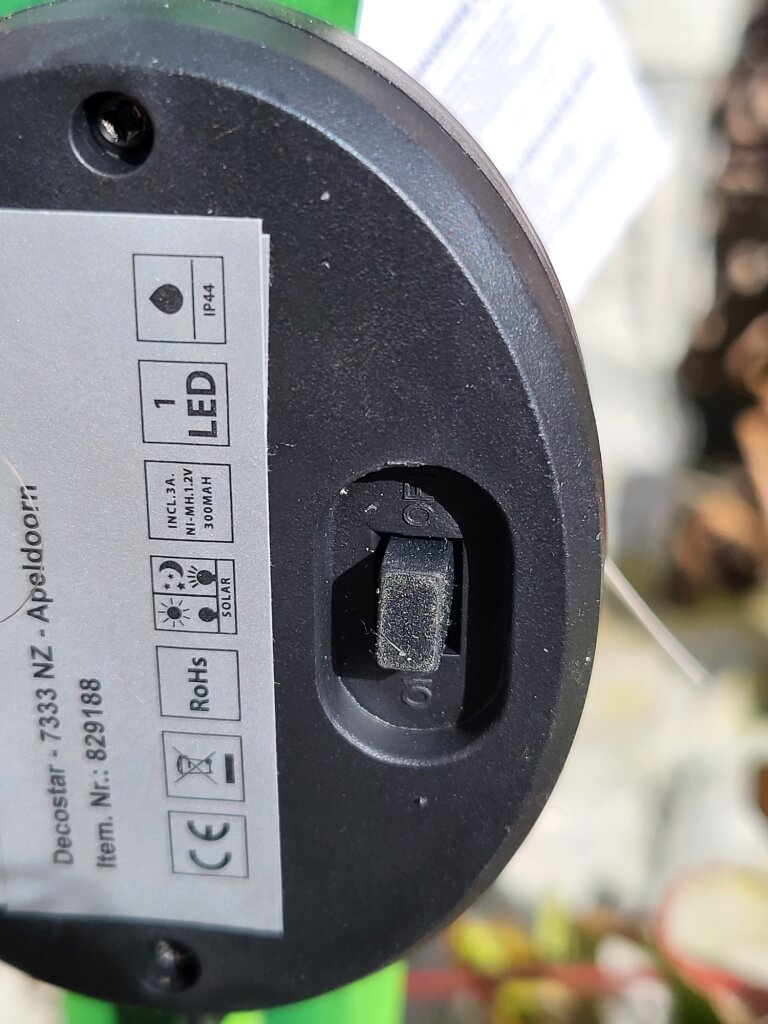 Das kleine Solarpanel ist seitlich am Stiel befestigt und muss vor Inbetriebnahme auf "On" gestellt werden.