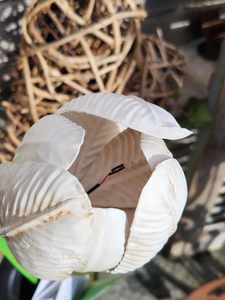 Die Tulpe ist aus lackiertem Metall gefertigt und besitzt im Inneren eine kleine LED-Lampe.