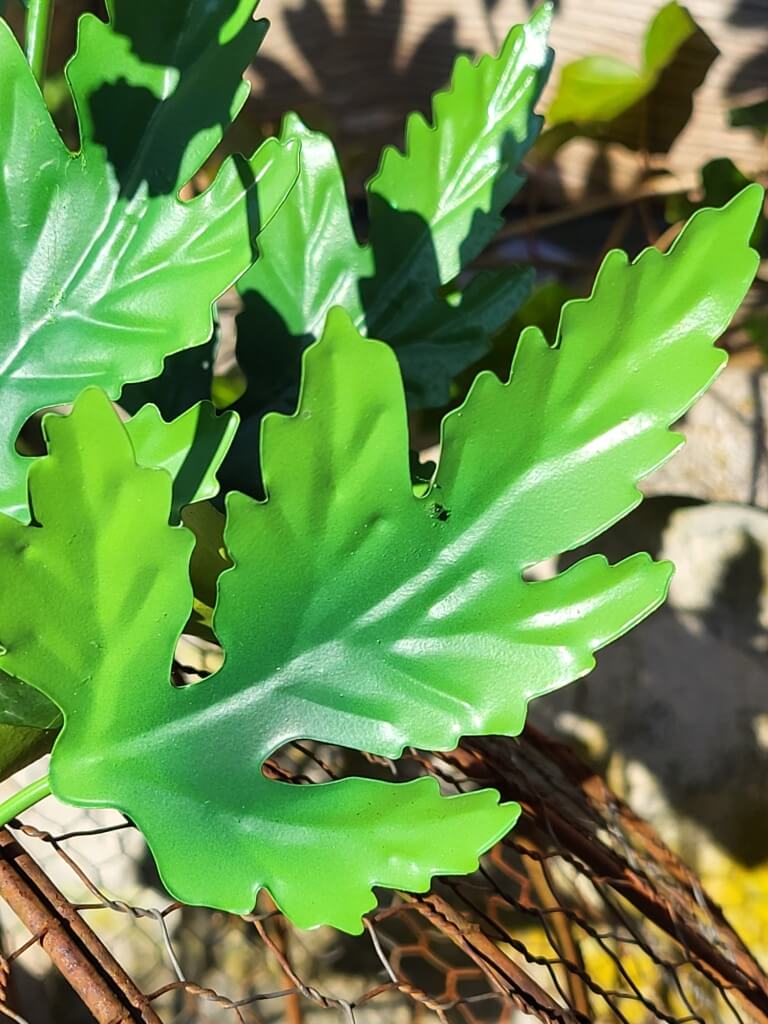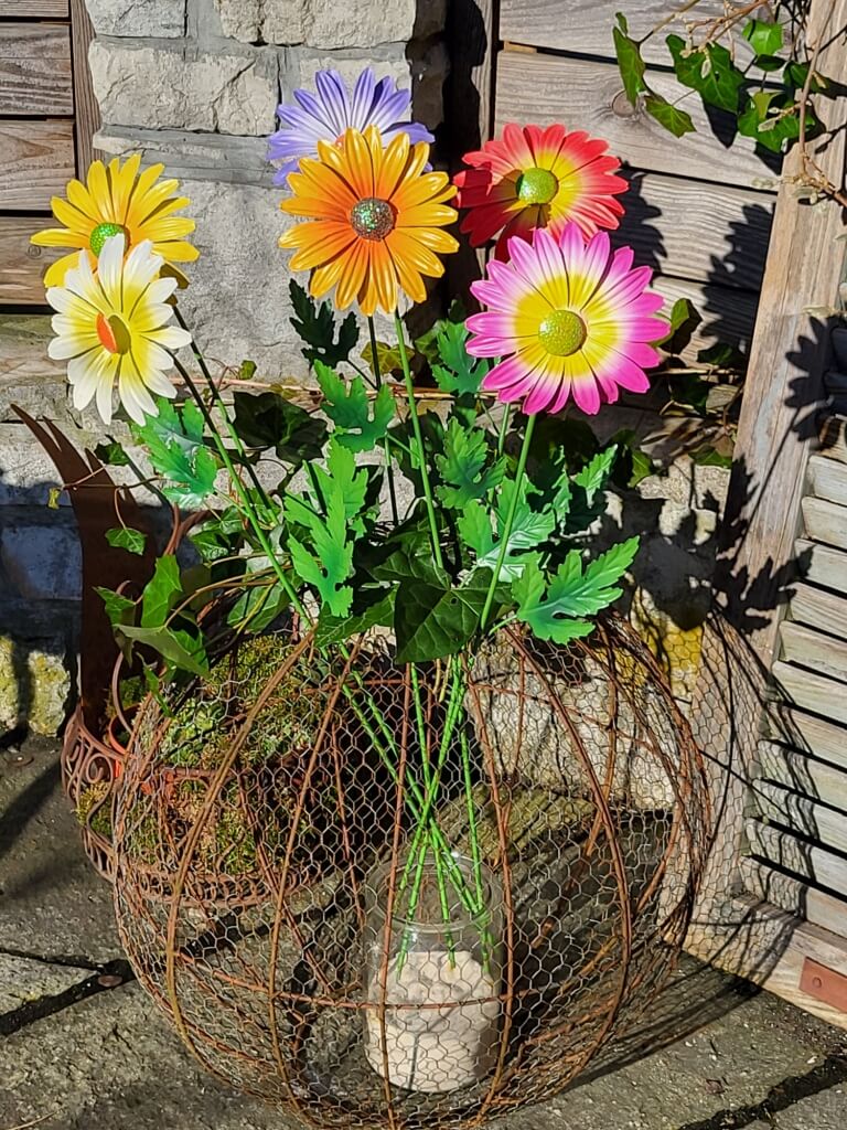 Ein absoluter Augenschmaus sind diese knallbunten Topfstecker aus lackiertem Metall in Blütenform mit filigranen Blättern am Stiel.