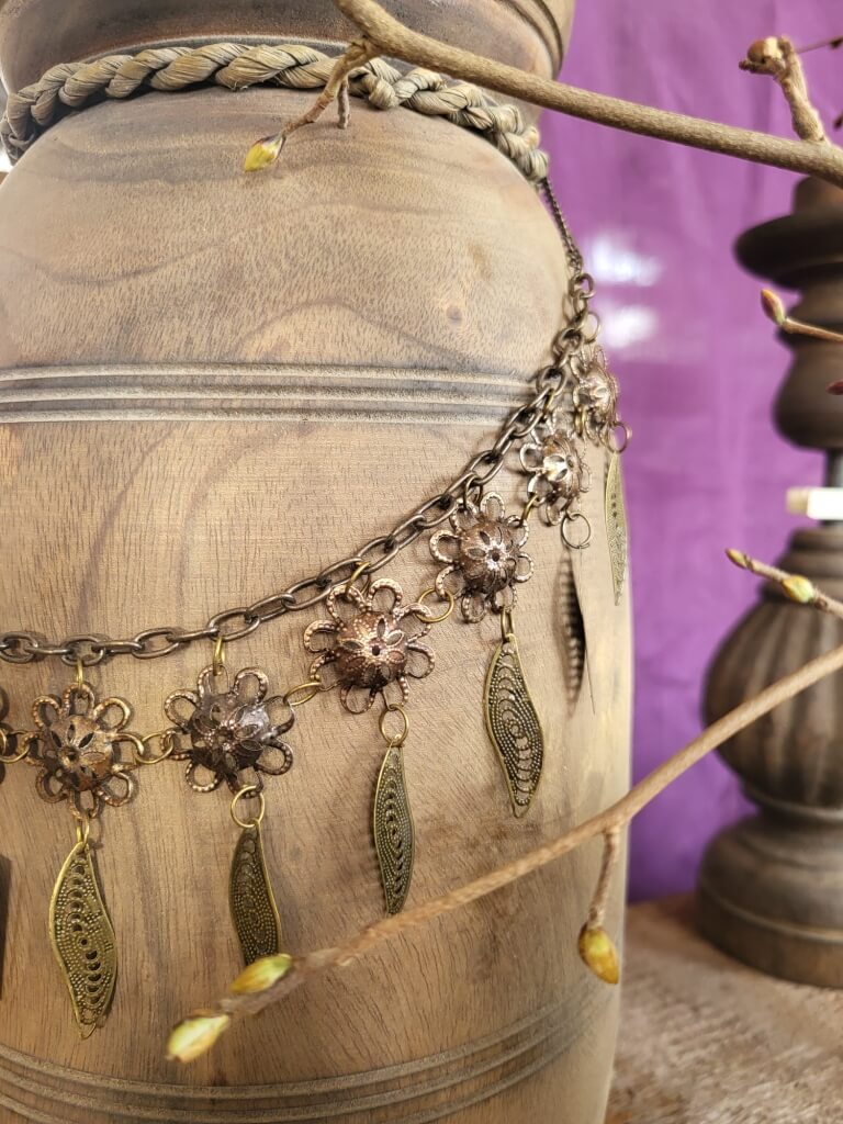 Die Kette besteht aus zahlreichen kleinen Blüten, die mit federartigen Abhängungen ergänzt werden.