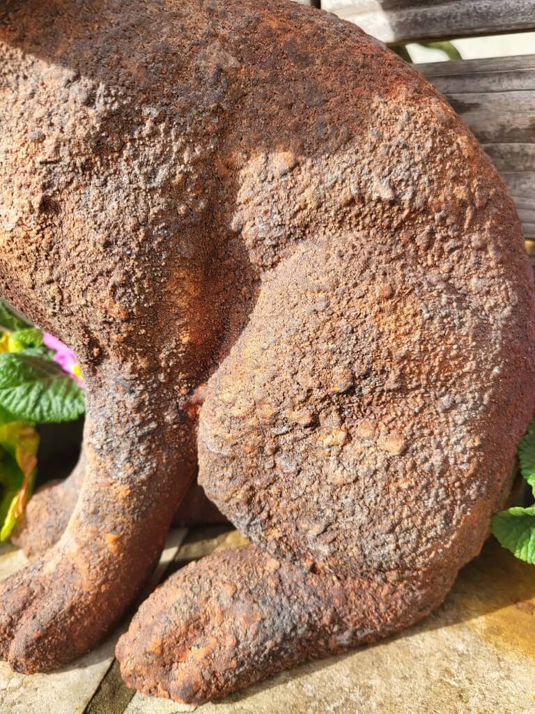 Der Hase in Betonoptik mit Edelrostfinish ist mit einer rauhen, rustikalen Oberfläche versehen.