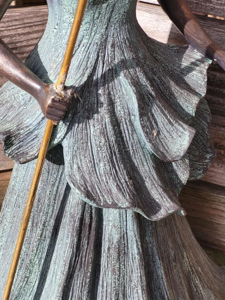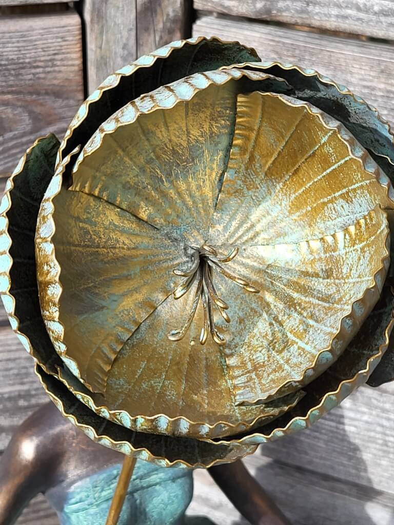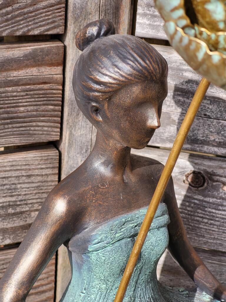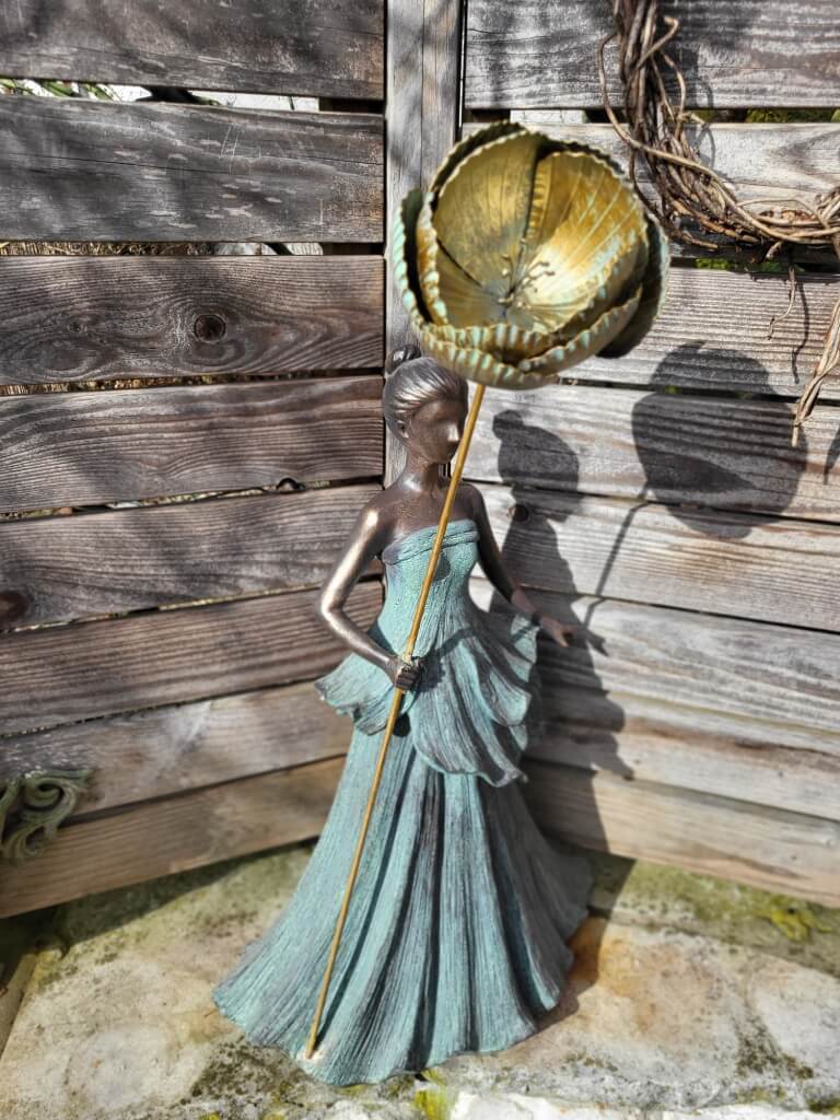 Ein absoluter Blickfang ist die große filigrane goldfarbene Metallblüte, welche die Fee, mit den leicht goldenen Haaren, in der Hand hält.