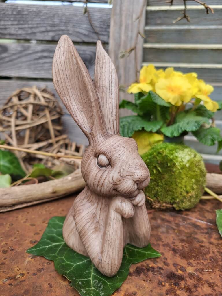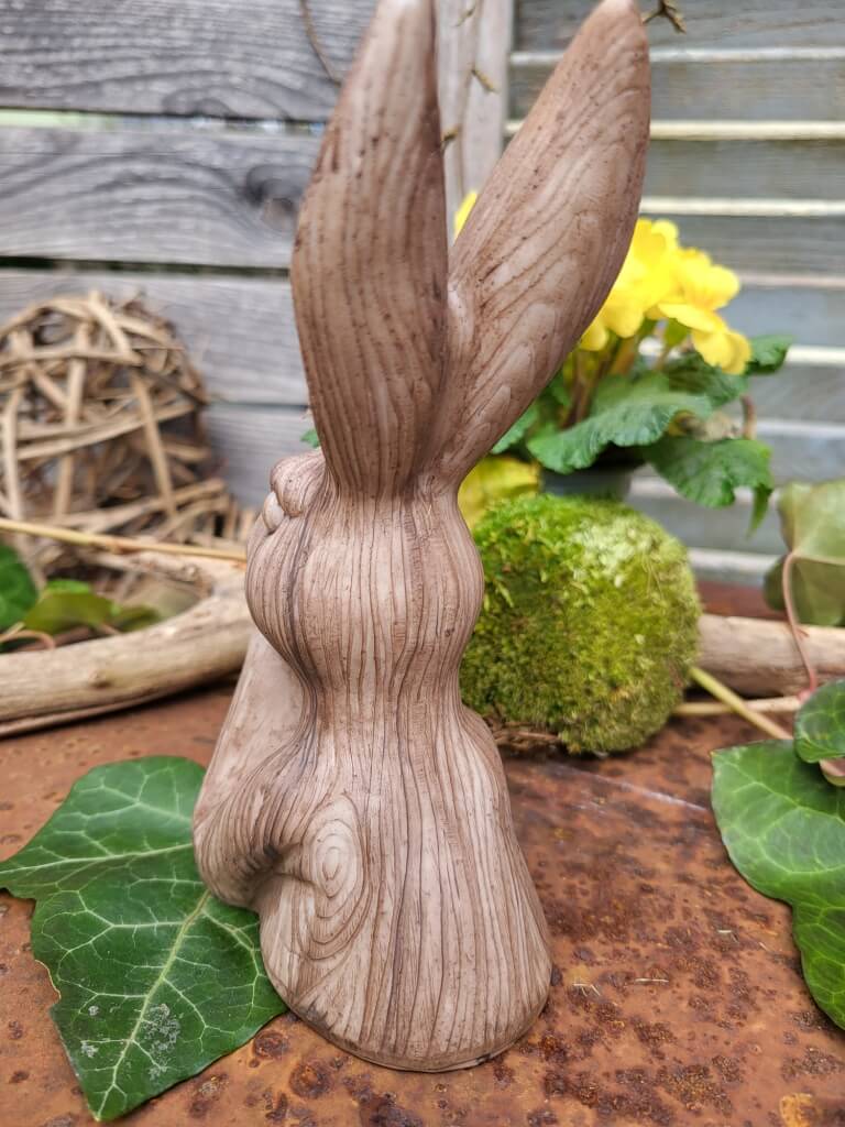 Die modern gestaltete und in Holzoptik gearbeitete Hasenbüste ist aus Polyresin gefertigt und ist die perfekte Osterdeko für innen und außen.