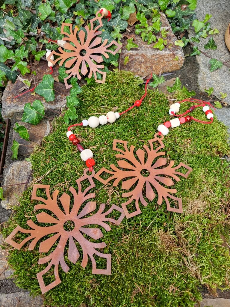 Zahlreiche Holzperlen in rot und natur machen die Flocke zu einem perfekten Hänger im Landhausstil.