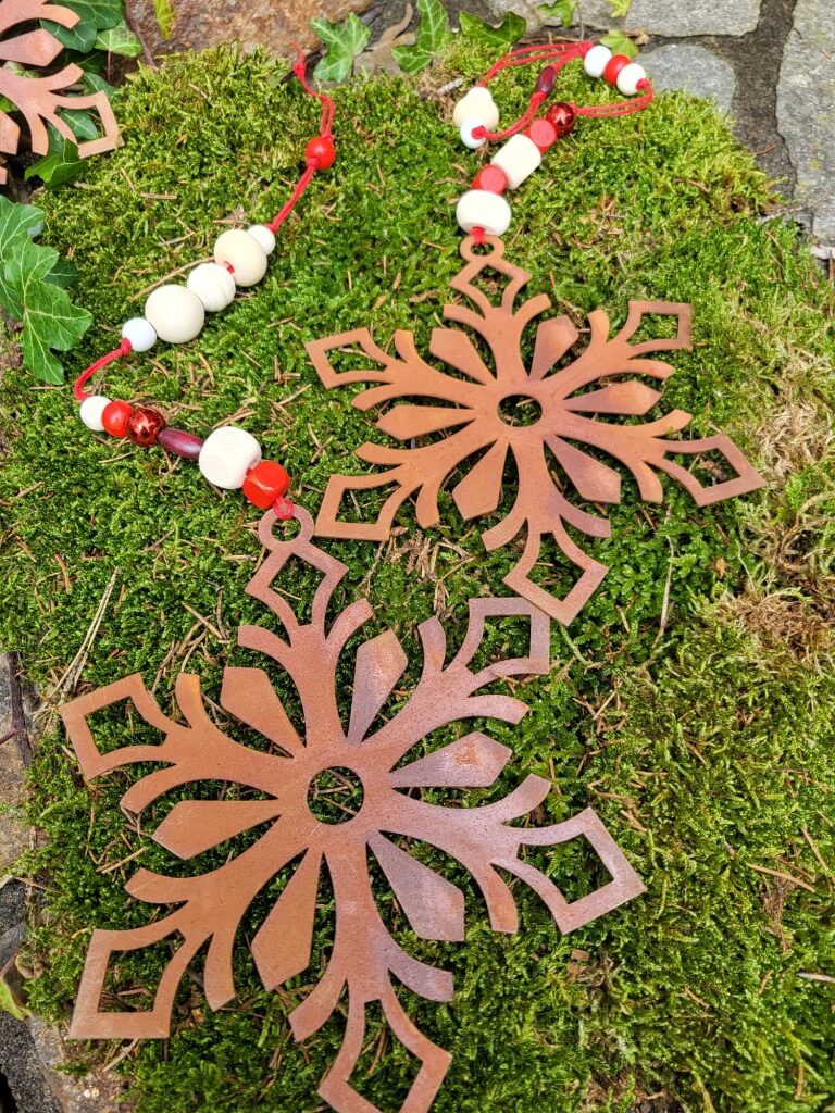 Die filigrane und schöne Schneeflocke aus Edelrost bezaubert durch die zusätzliche, liebevoll gestaltete Holzdeko in rot.