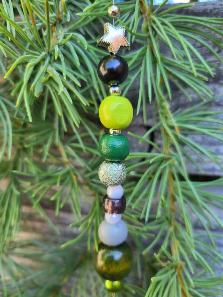 Zahlreiche grüne Holzperlen und ein kleiner Roststern prägen diese Weihnachtskette.