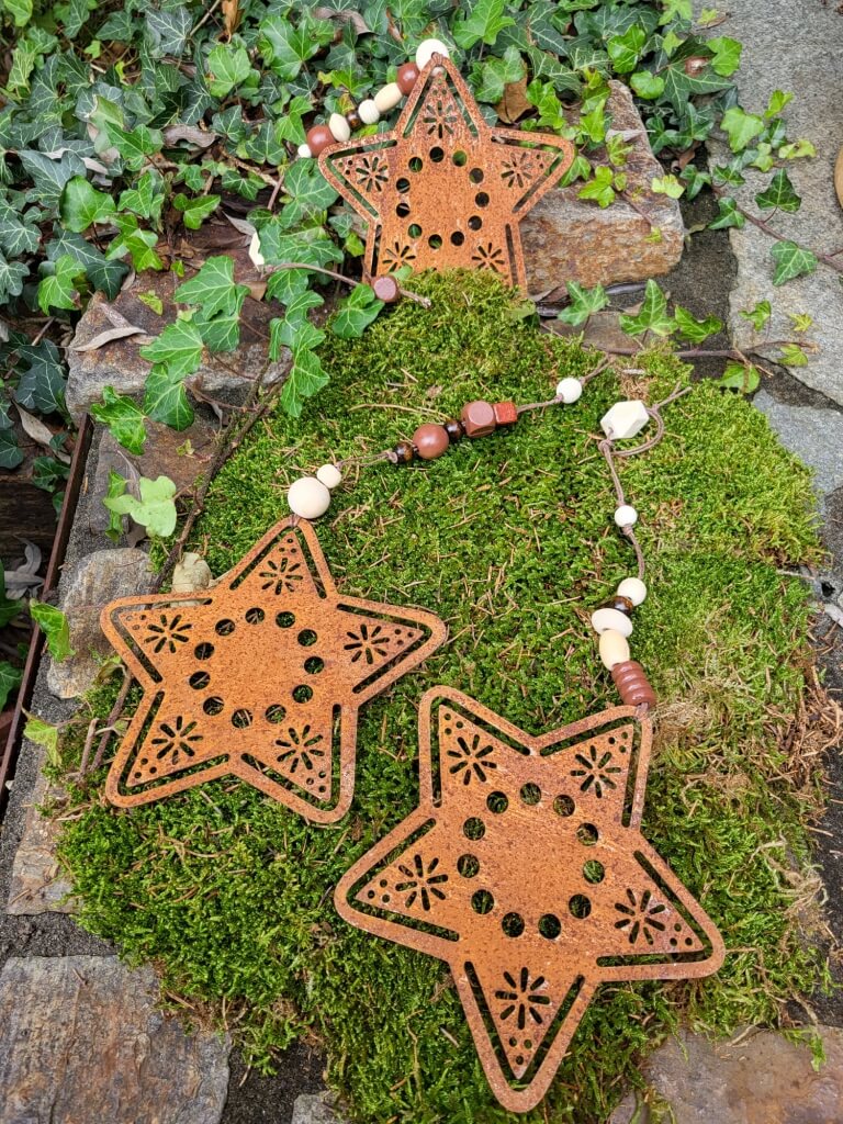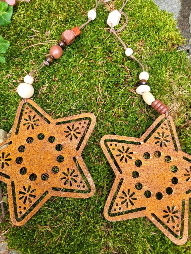 Ein außergewöhnlicher Stern, der fast ein wenig an einen Lebkuchenstern erinnert, ist mit zahlreichen Holzperlen in Naturtönen verziert.